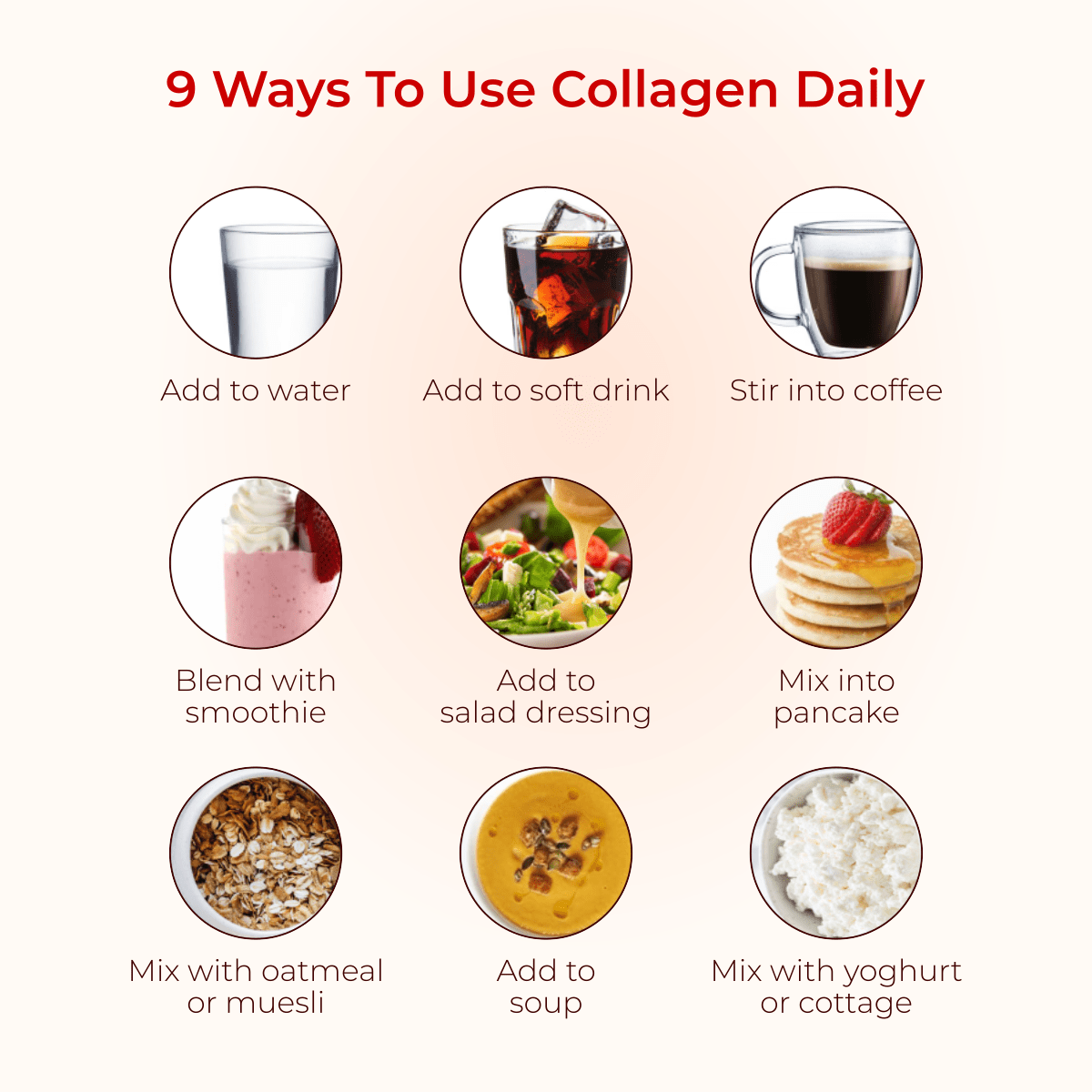 Lengvam kolageno įsisavinimui organizme reikalingos labai mažų dalelyčių susmulkintos kolageno molekulės. Tai atliekama hidrolizuojant kolageną. Paruoštas hidrolizuoto kolageno gėrimas – paprastas būdas papildyti šio komponento trūkumą: per virškinimo sistemą jis patenka tiesiai į kraujotaką ir keliauja ten, kur jo trūksta. Išgėrus hidrolizuoto kolageno, jis prasiskverbia pro žarnyno gleivinę, kaupiasi odoje, kremzlėse, stimuliuoja kolageno gamybą. Didžiausia kolageno koncentracija stebima jau po 6 val.