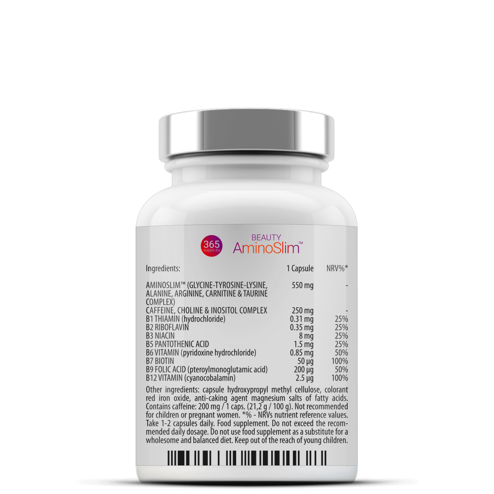 | Sastāvdaļas: AminoSlim™ komplekss (glicīns, tirozīns, lizīns, β-alanīns, arginīna hidrohlorīds, karnitīna tartrāts, taurīns), kofeīns, hidroksipropilmetilceluloze, holīna bitartrāts, inozīts, nikotīnamīds, kalcija D-pantotenāts, piridoksīna hidrohlorīds, riboflavīns, tiamīna hidrohlorīds, pteroilmonoglutamīnskābe, D-biotīns, ciānokobalamīns, krāsa dzelzs oksīdi, pretsalipes viela taukskābju magnija sāļi. Satur kofeīnu: 200 mg / 1 kaps. (21,2 g / 100 g). Nav ieteicams bērniem un grūtniecēm. |