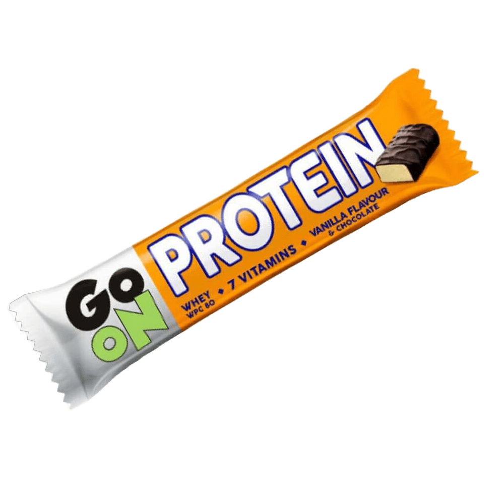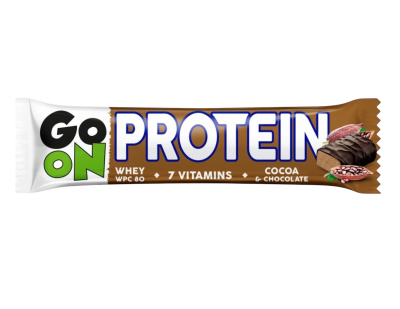 Protein bar GO ON coated in dessert chocolate, is a delicious bar made for athletes that wins against other sweets. Rich in nutritious whey protein WPC 80 and enriched with vitamins, it provides essential nutrients for physically active people.