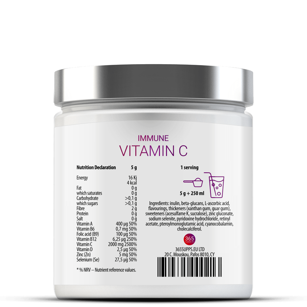 Пищевая ценностьVITAMIN CРазмер порции: 1 мерные ложки (ложка прилагается) (5 g)Количество порций: 73 (365 g)