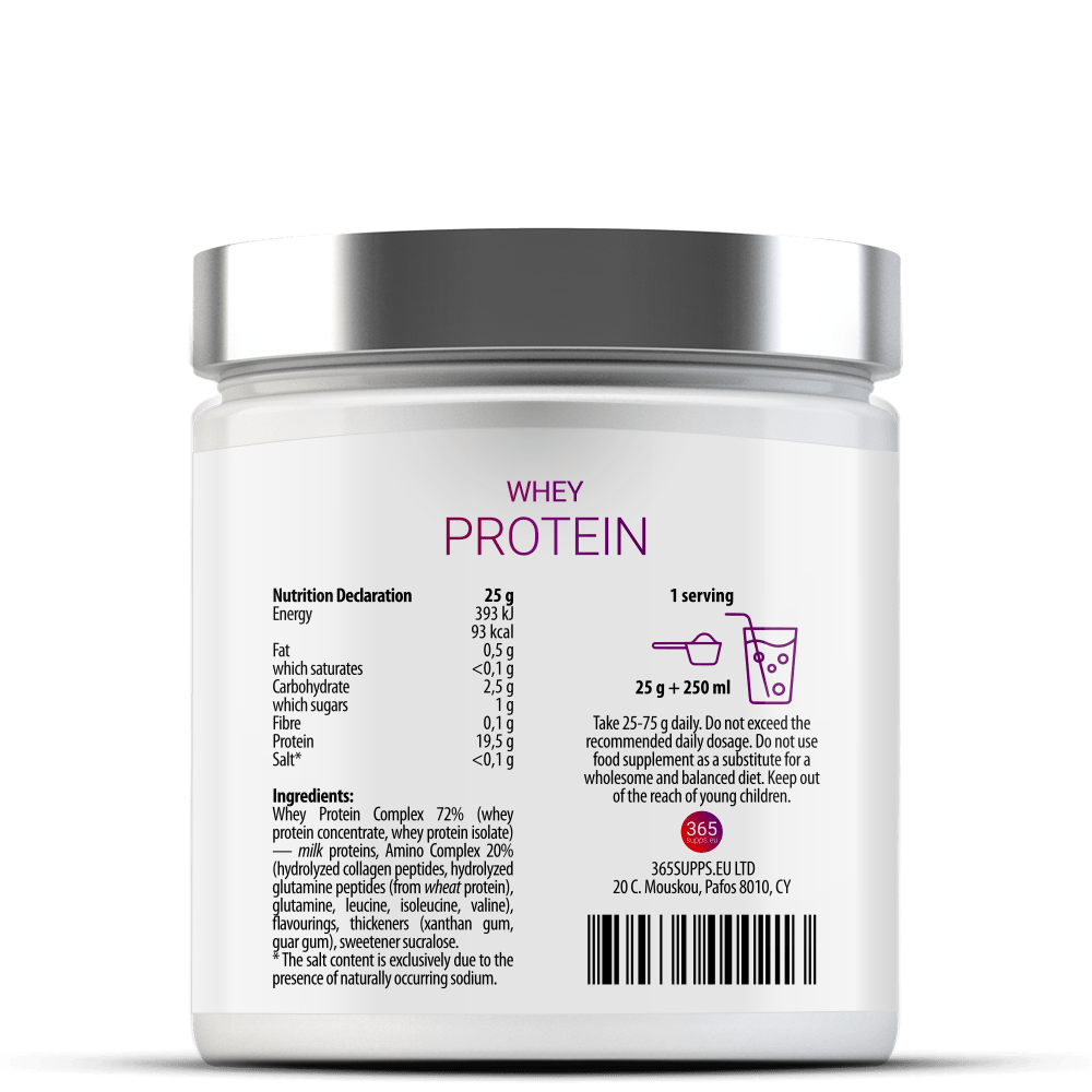 | Состав: сывороточный белок 72% (концентрат и изолят сывороточного белка) - молочный продукт, аминокислотный комплекс 20% (гидролизованный коллаген, пептиды глутамина (гидролизат пшеничного белка), аминокислоты с разветвленной цепью BCAA (лейцин, изолейцин, валин)), ароматизаторы, загустители (ксантановая камедь, гуаровая камедь), подсластитель сукралоза. * Содержание соли исключительно за счёт наличия натрия естественного происхождения. | ||||